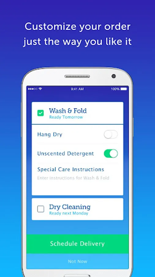 - Next morning delivery is available for late night Wash & Fold laundry pickups.