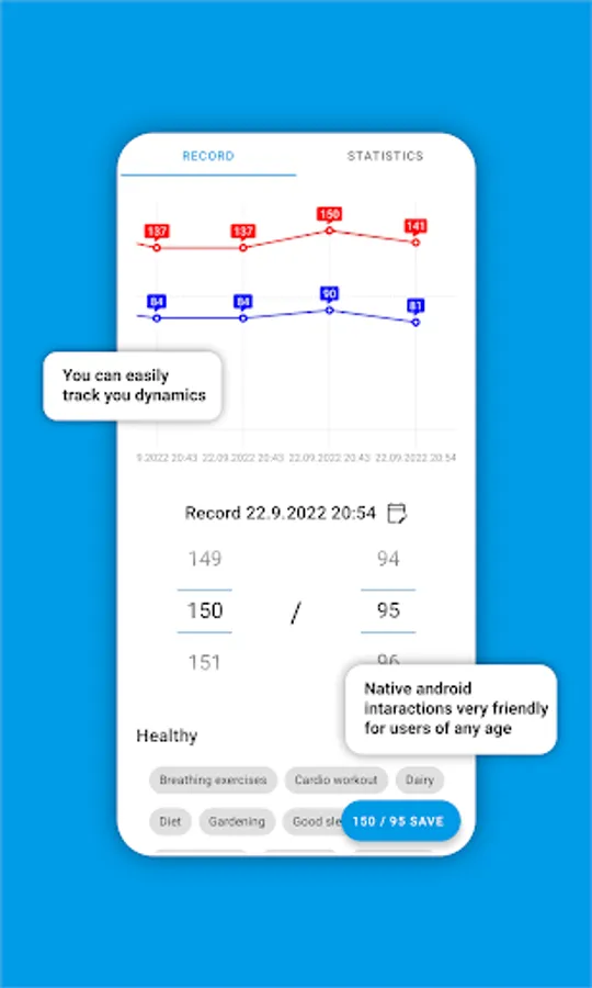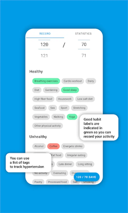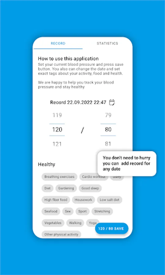Set your current blood pressure and press save button. You also can change the date and set exact tags about your activity, food and health. You can record your blood pressure with floating button for your convenience when scrolling the screen