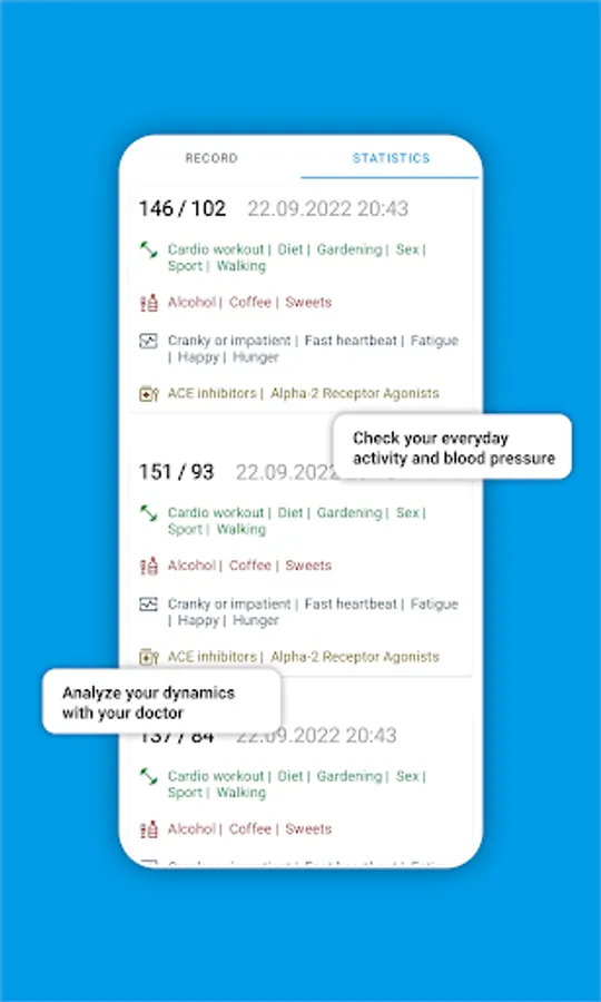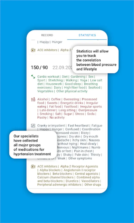 But the most useful is the additional statistics tab. It will allow you to keep track of your blood pressure. See all your colored tags and track the correlation between blood pressure and lifestyle.