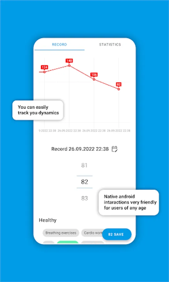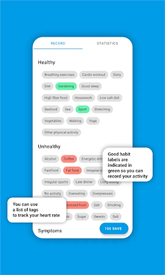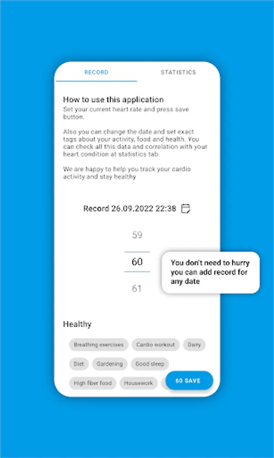 Set your current heart rate and press save button. You also can change the date and set exact tags about your activity, food and health. You can record your cardio data with floating button for your convenience when scrolling the screen