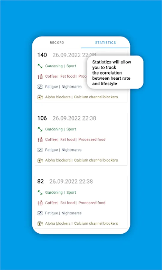 But the most useful is the additional statistics tab. It will allow you to keep track of your heart rate. See all your colored tags and track the correlation between cardio status and lifestyle.