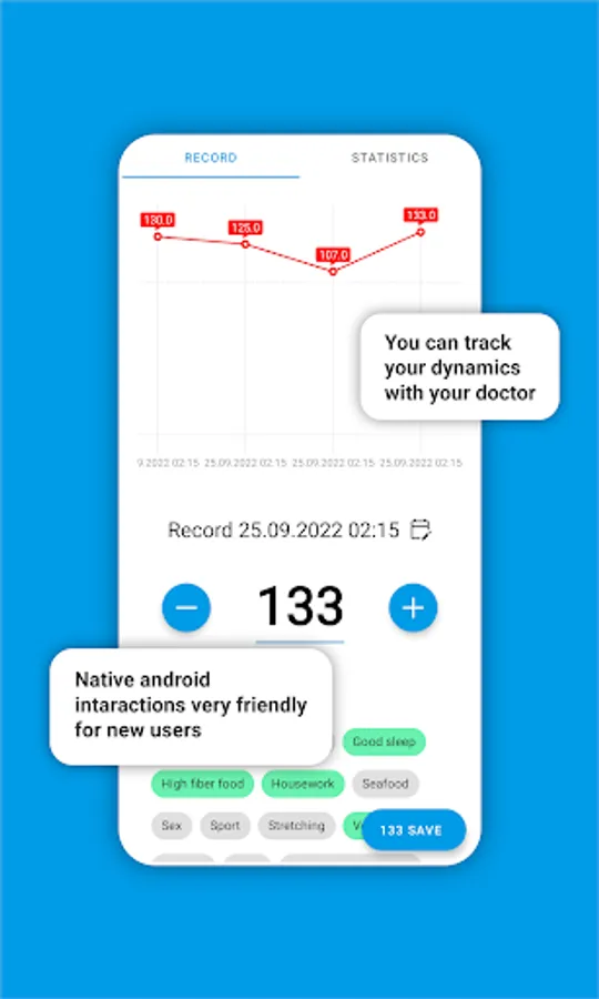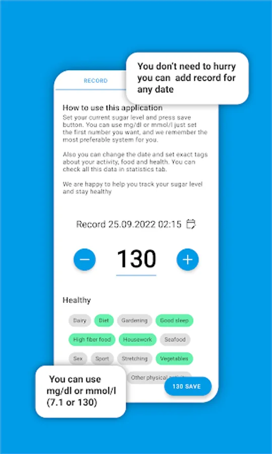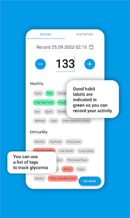 Also you can change the date and set exact tags about your activity, food and health. You can check all this data and correlation with your glucose level in your blood at statistics tab.