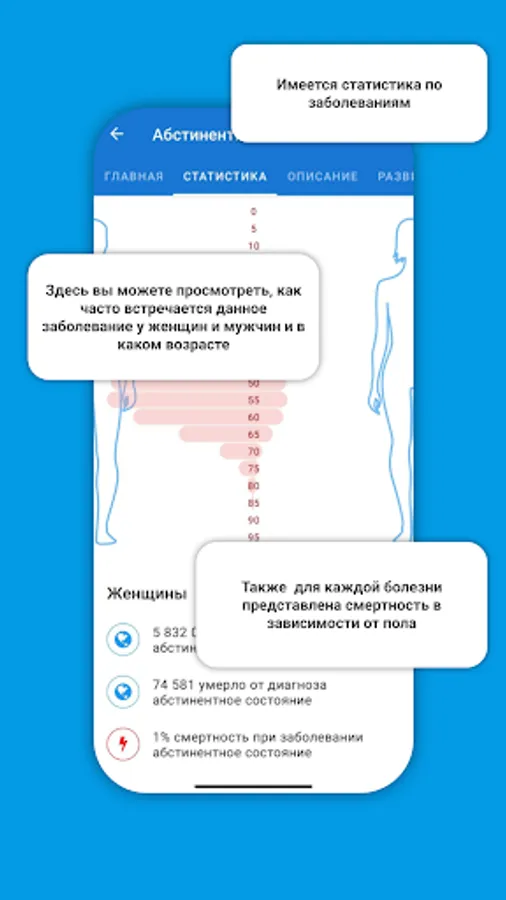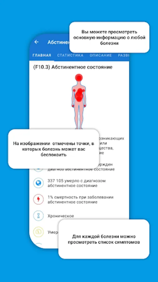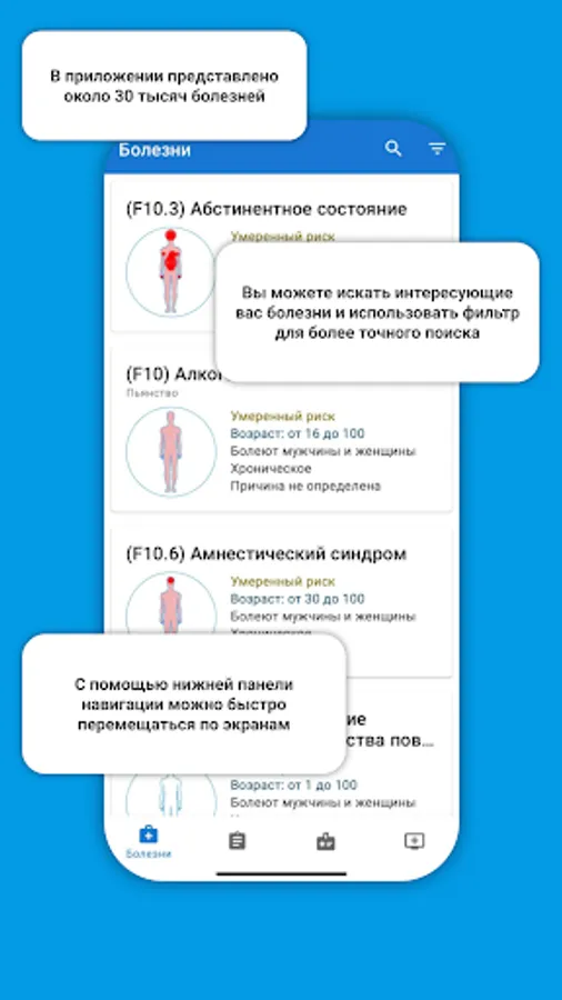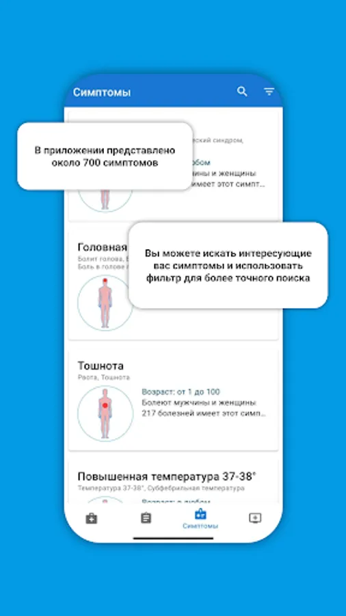 Our mobile medical application is a free and reliable assistant for everyone who cares about their health. Here you will find information about the symptoms of diseases and what actions you need to take to get help from doctors.