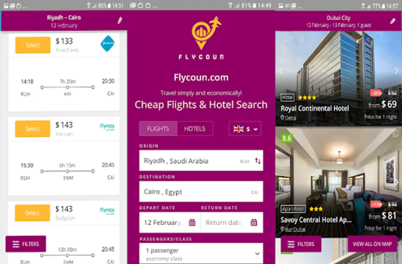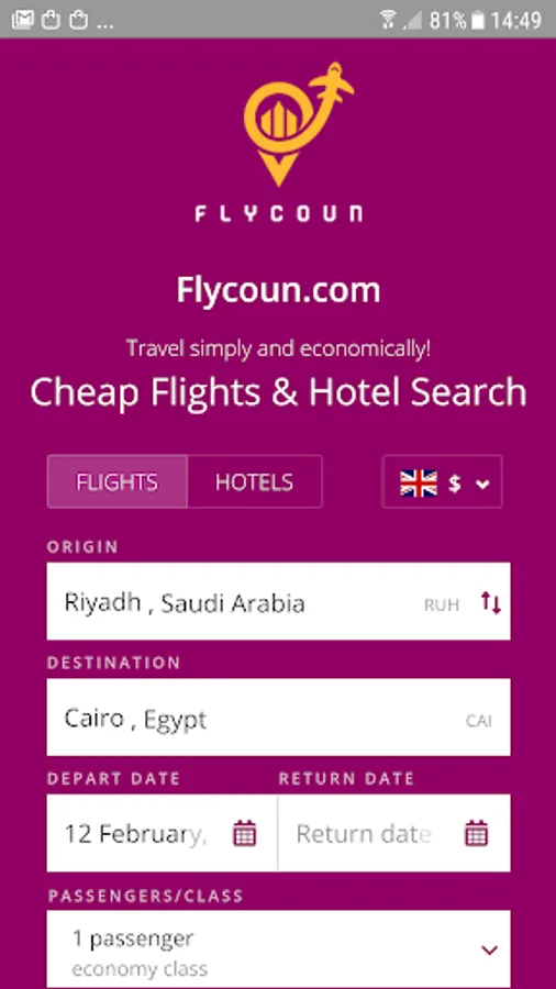 FLYCOUN is an all-in-one travel app with flights, hotels and apartments rentals, all in one place.