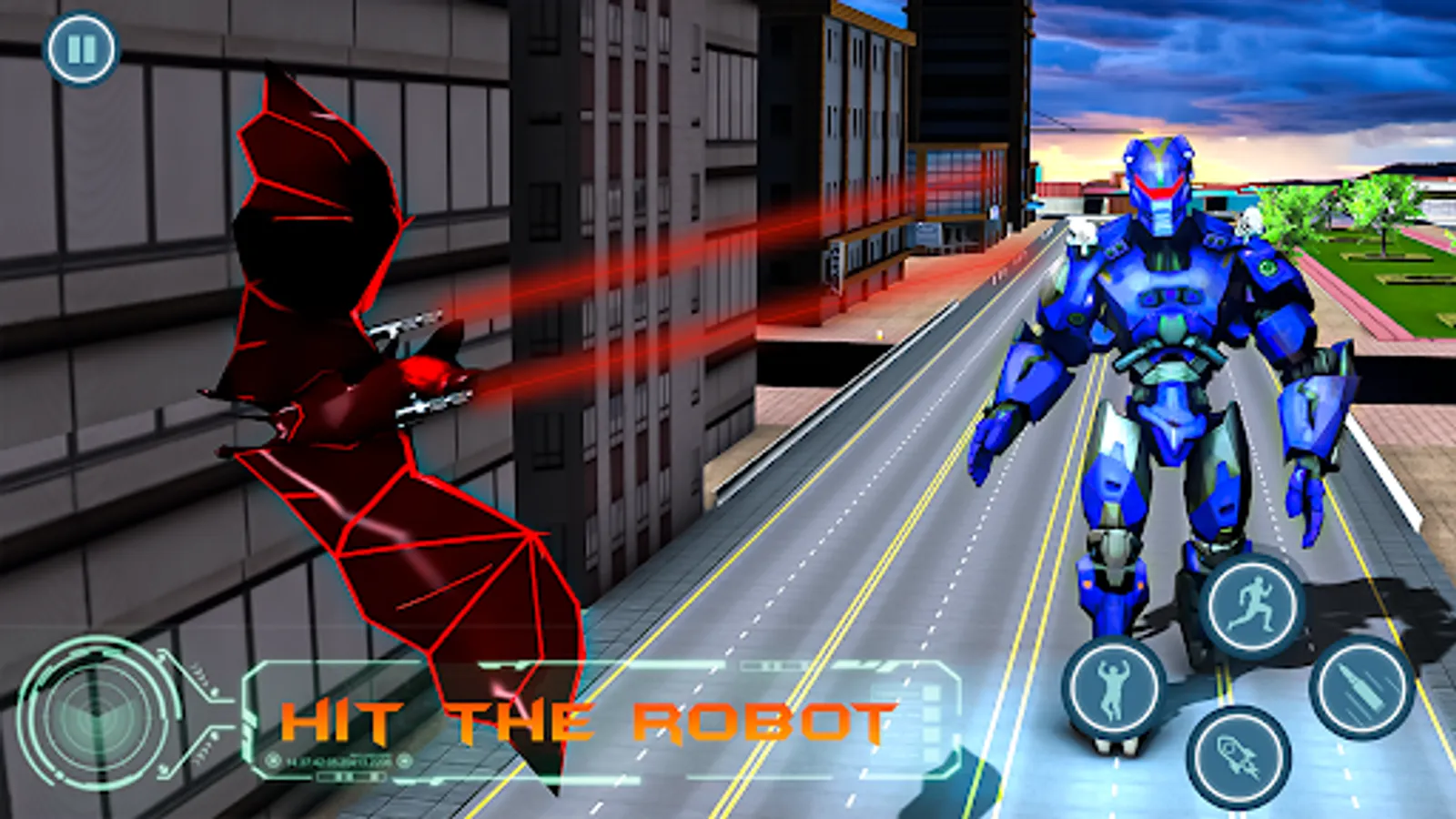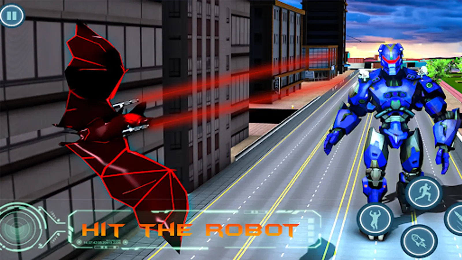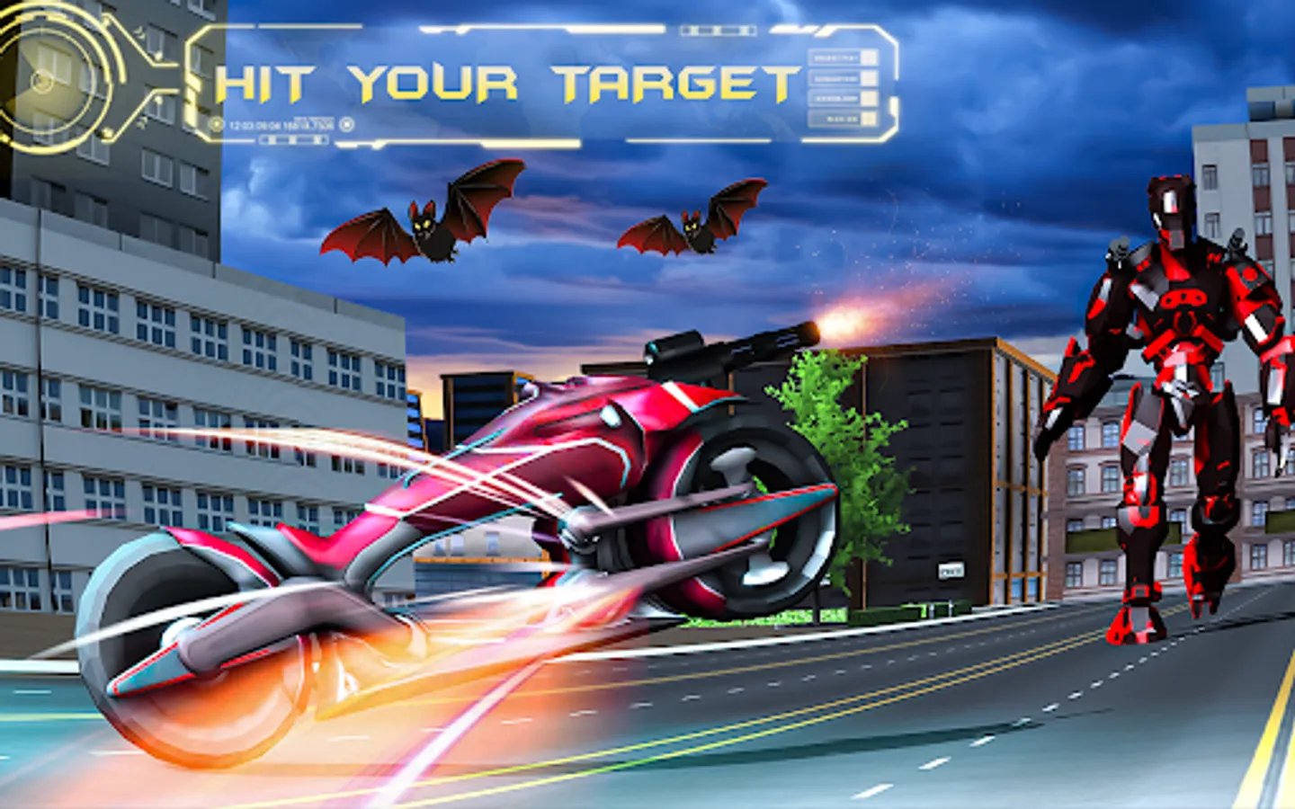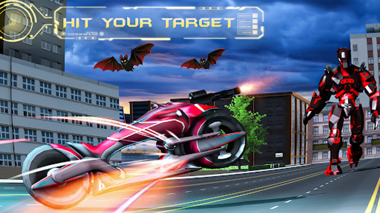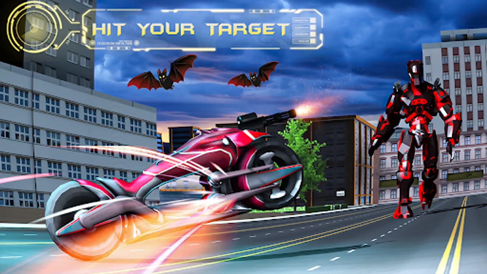The futuristic robot battle has started in this flying bike robots transformation game. Street crime is increasing daily and crime is going of control. Flying bat robot transformation game has real city rescue mission from crime. In this game robot can transform into a flying bike for crime fighting with other and robots to complete mission.