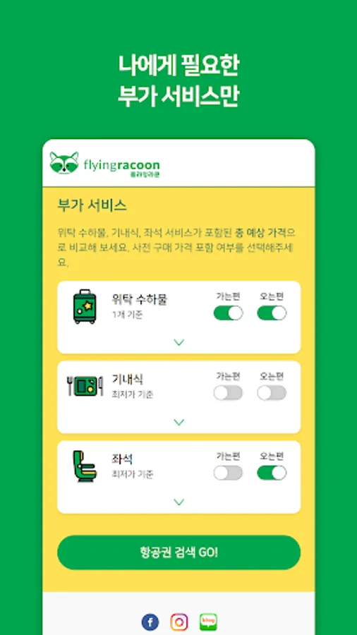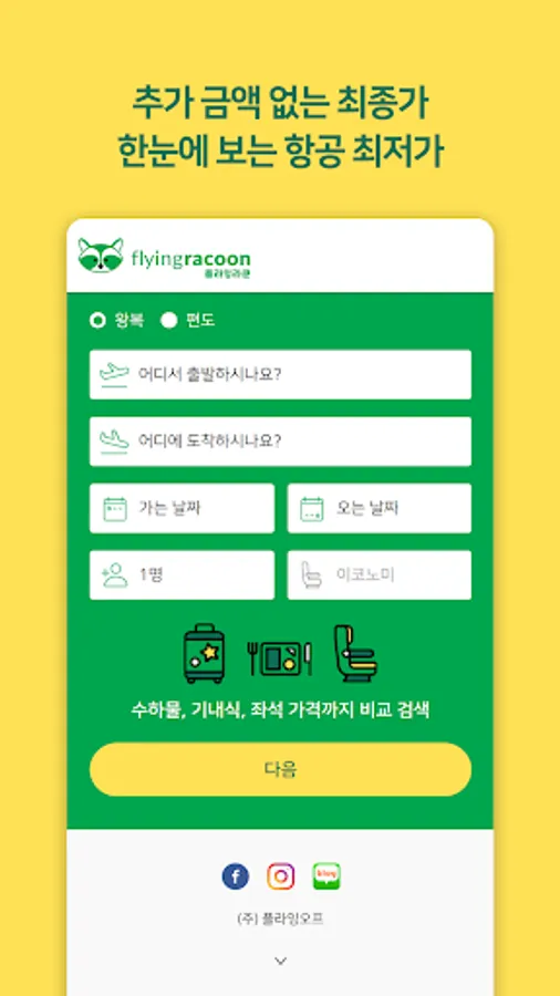 The smart Flying Raccoon that compares the final price of checked/extra baggage, in-flight meals, advance seat, pet check-in, and all tickets at the lowest price. Download now!
