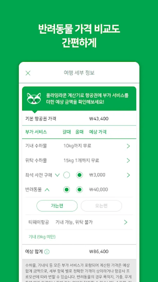 Traveling with your beloved pet, there are a lot of things to pack, right? We will check the flights for which pets can be checked in and the additional amount at once before payment!