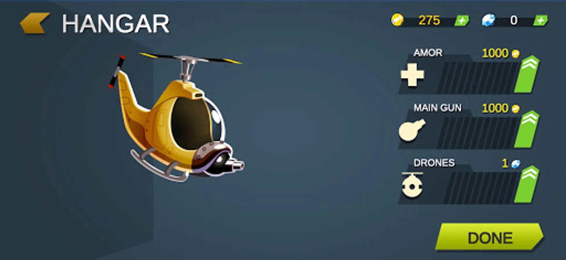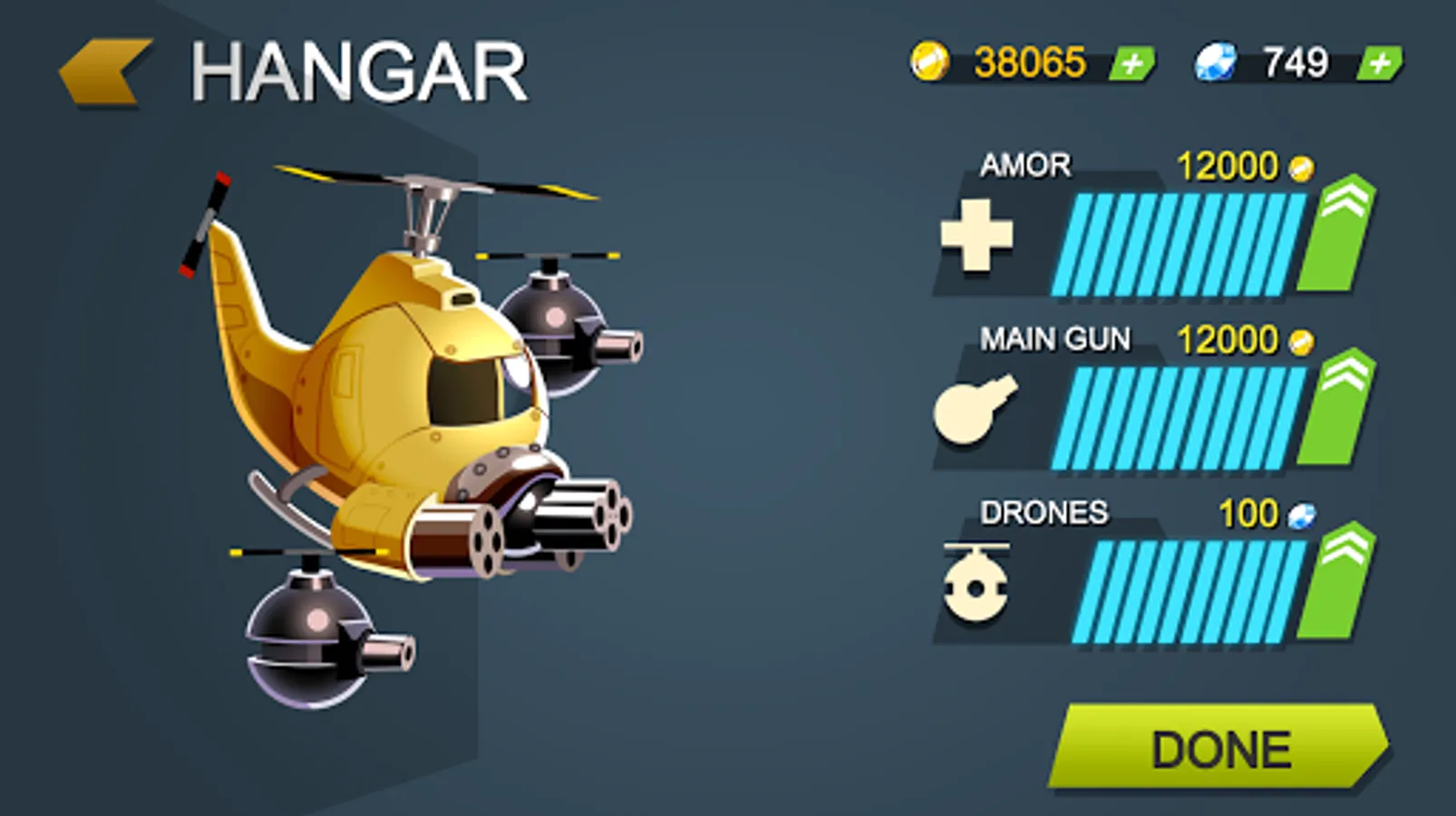In the game you can collect gold coins and upgrade Helicopter. Choose different equipment to upgrade!