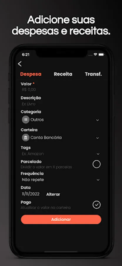 The budget function helps you not to spend more than expected on a specific expense category. For example, you can define spending up to BRL 1,000.00 with the Food category. Also, you can create new categories according to your demand.