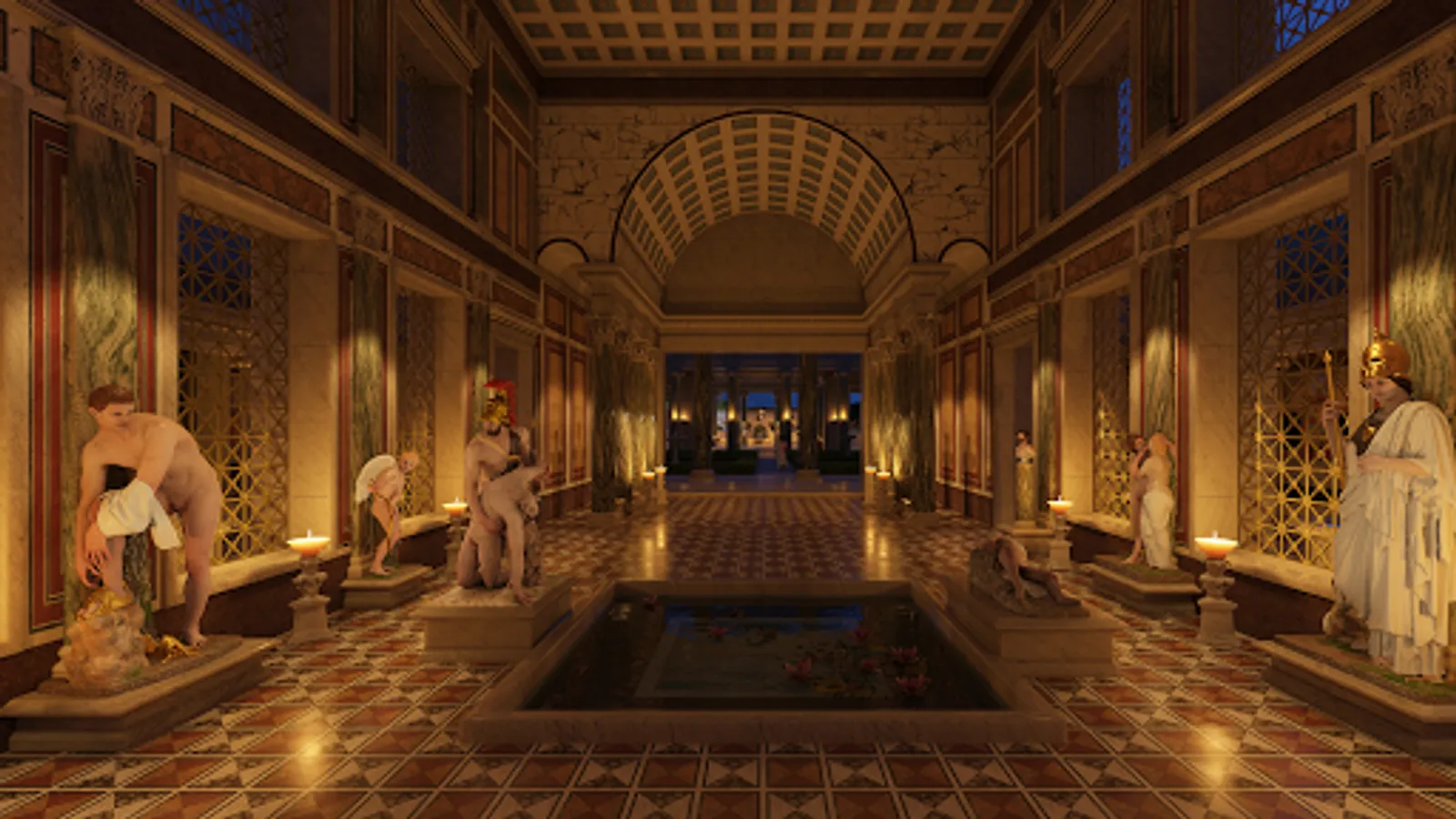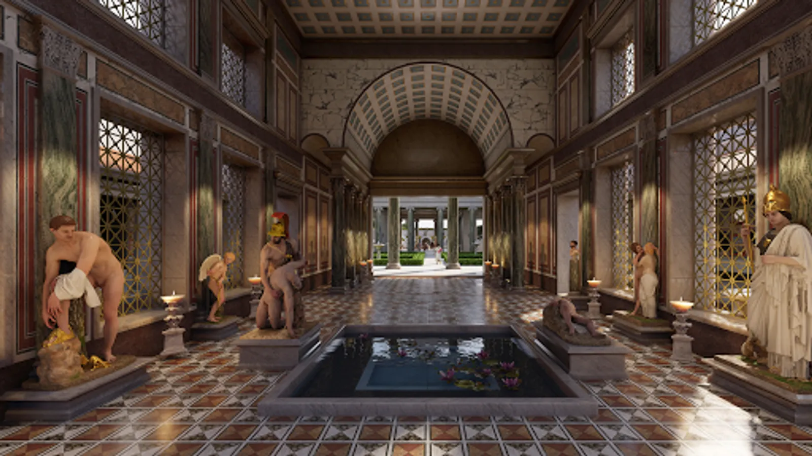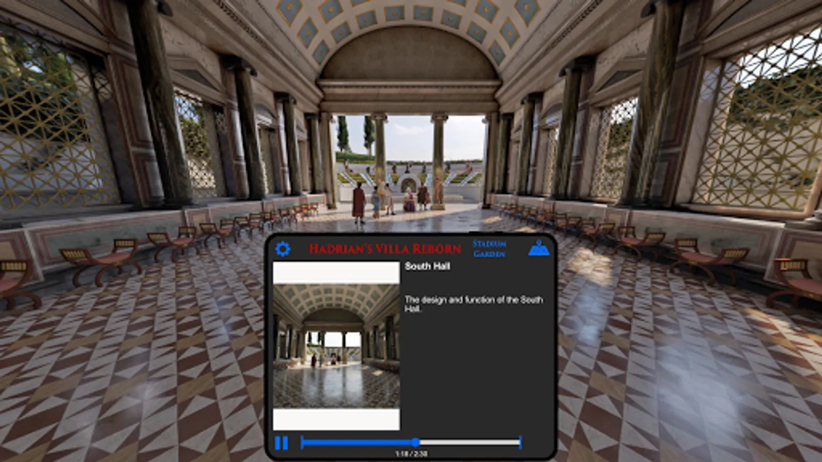 Your guide is Prof. Bernard Frischer, Director of the Digital Hadrian’s Villa Project (http://vwhl.soic.indiana.edu/villa/). As you follow your curiosity and explore the highly accurate 3D reconstruction, you can play audio tracks in which Prof. Frischer explains what you are seeing and how the place was used in Hadrian’s day. Learn about imperial audiences, the imperial court, the Praetorian Guard, what went on at the emperor’s private banquets, and the Roman elite habit of the ambulatio. Understand how the Romans cleverly designed the rooms to be airy and cool during the heat of summer. Visit the emperor’s very own private dining room, and see the impressive North Hall, South Hall, the lovely North Garden with its surrounding peristyle. The dining room was used at night, so we even let you see how enchanting the complex becomes when lit by the artificial light of lamps, candelabra, and torches.