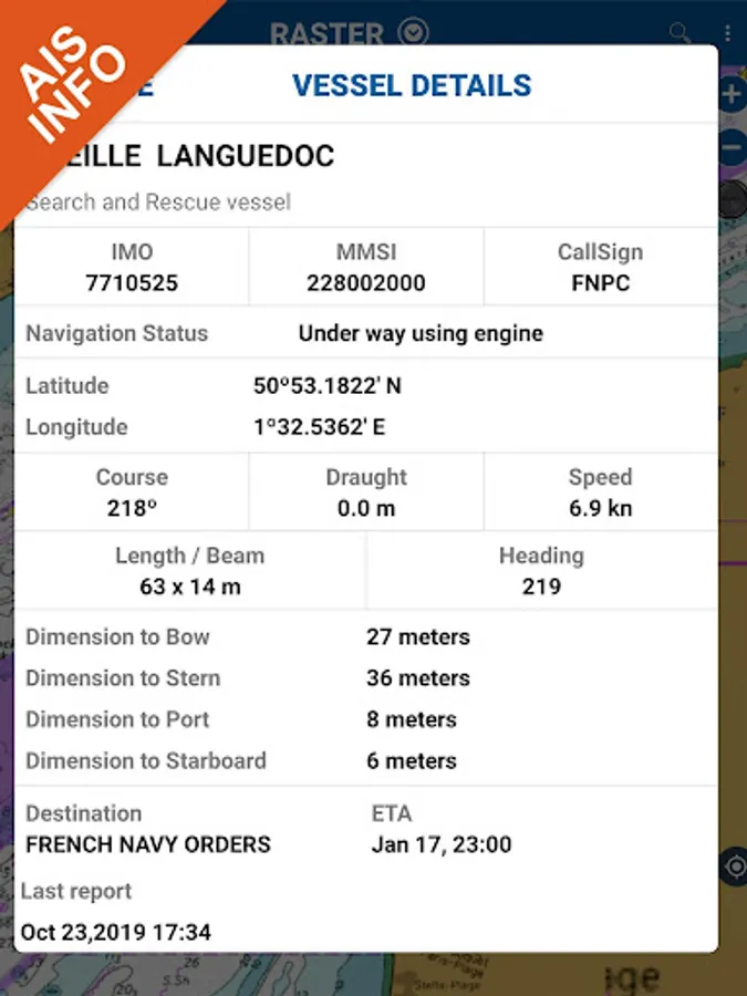 Select any target to see vessel details such as name, MMSI, IMO, call sign, status, speed, heading, coordinates, distance from your GPS location & more.