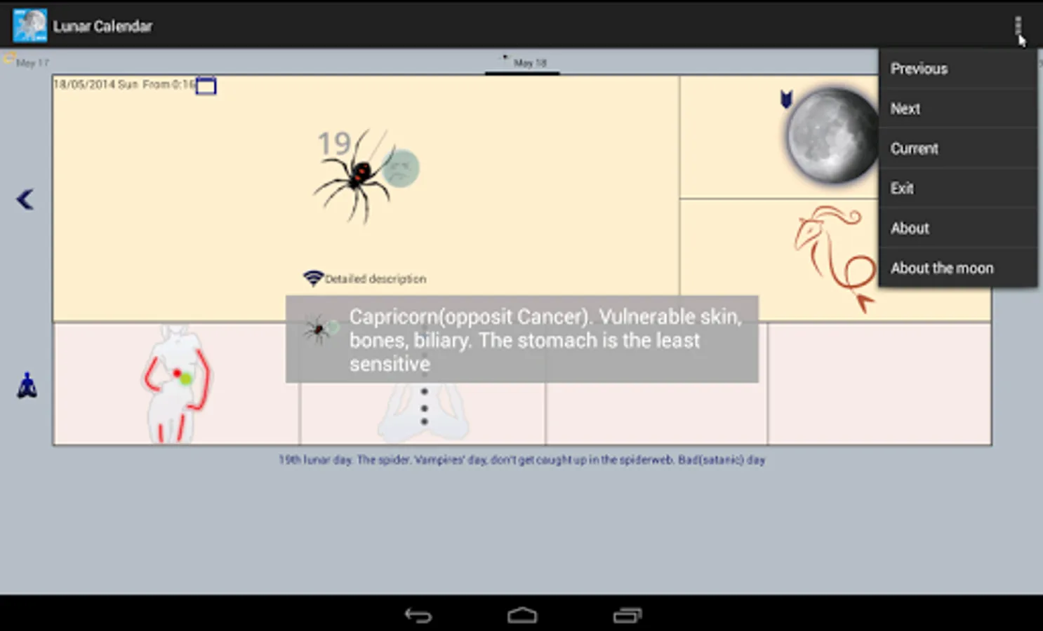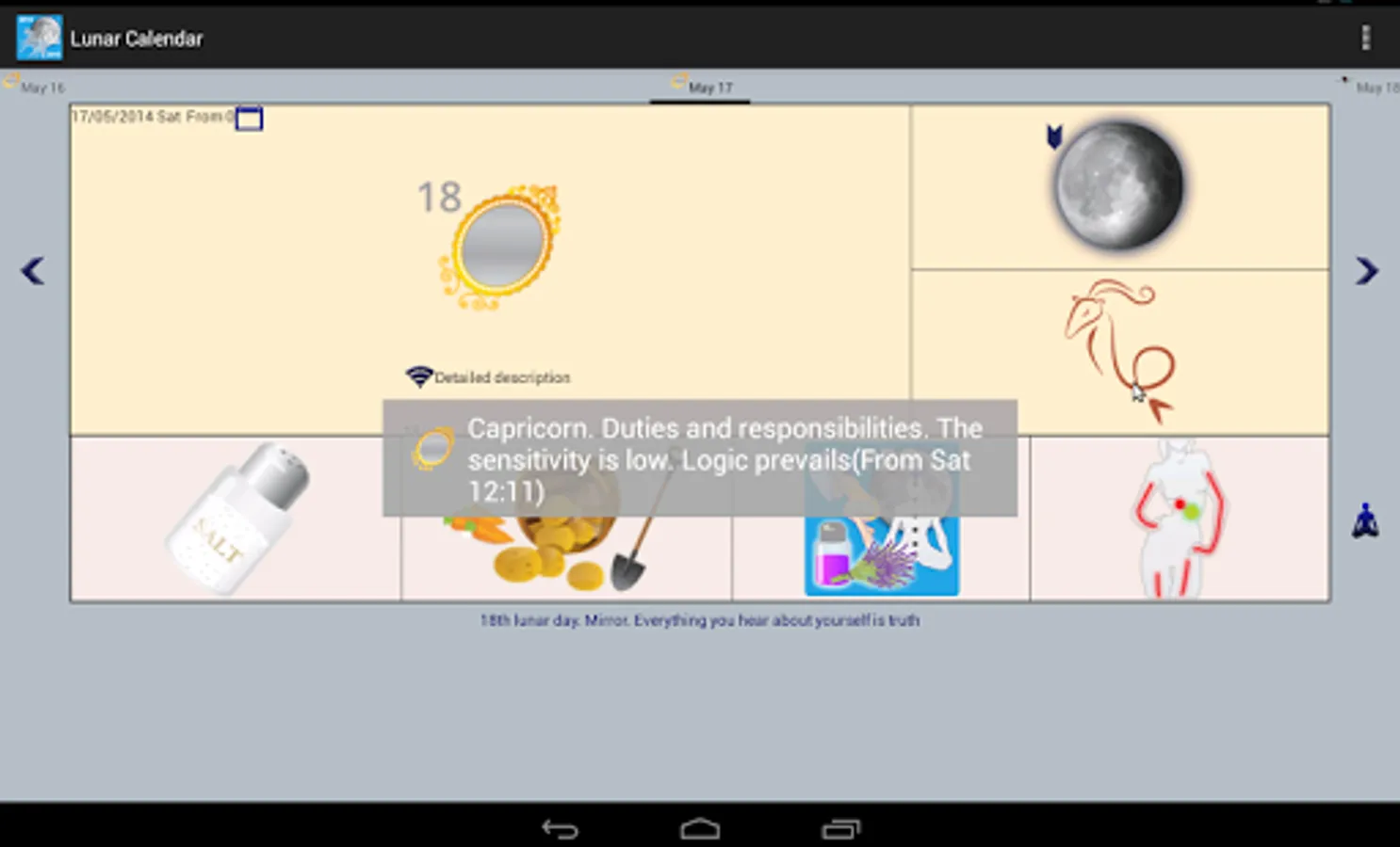 Lunar Calendar shows properties for each day: