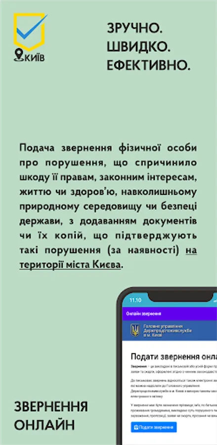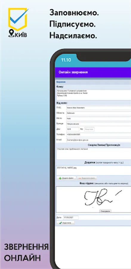 The block "Your signature" is required to sign the appeal, which is submitted to the Main Department of the State Food and Consumer Service in Kyiv, filled in with your finger on the screen (for a smartphone or tablet).