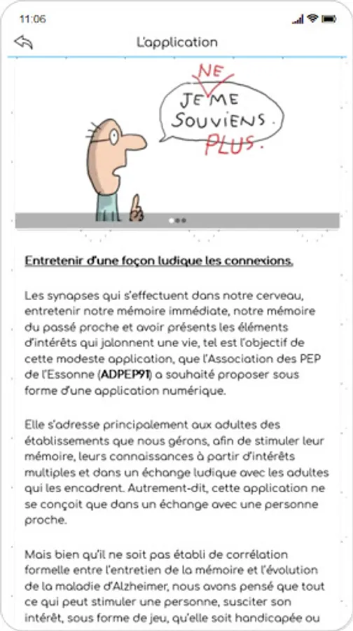 The synapses which are carried out in our brain, to maintain our immediate memory, our memory of the near past and to have present the elements of interest which mark out a life, such is the objective of this modest application, that the Association of the PEP of Essonne (ADPEP91) wanted to offer in the form of a digital application.