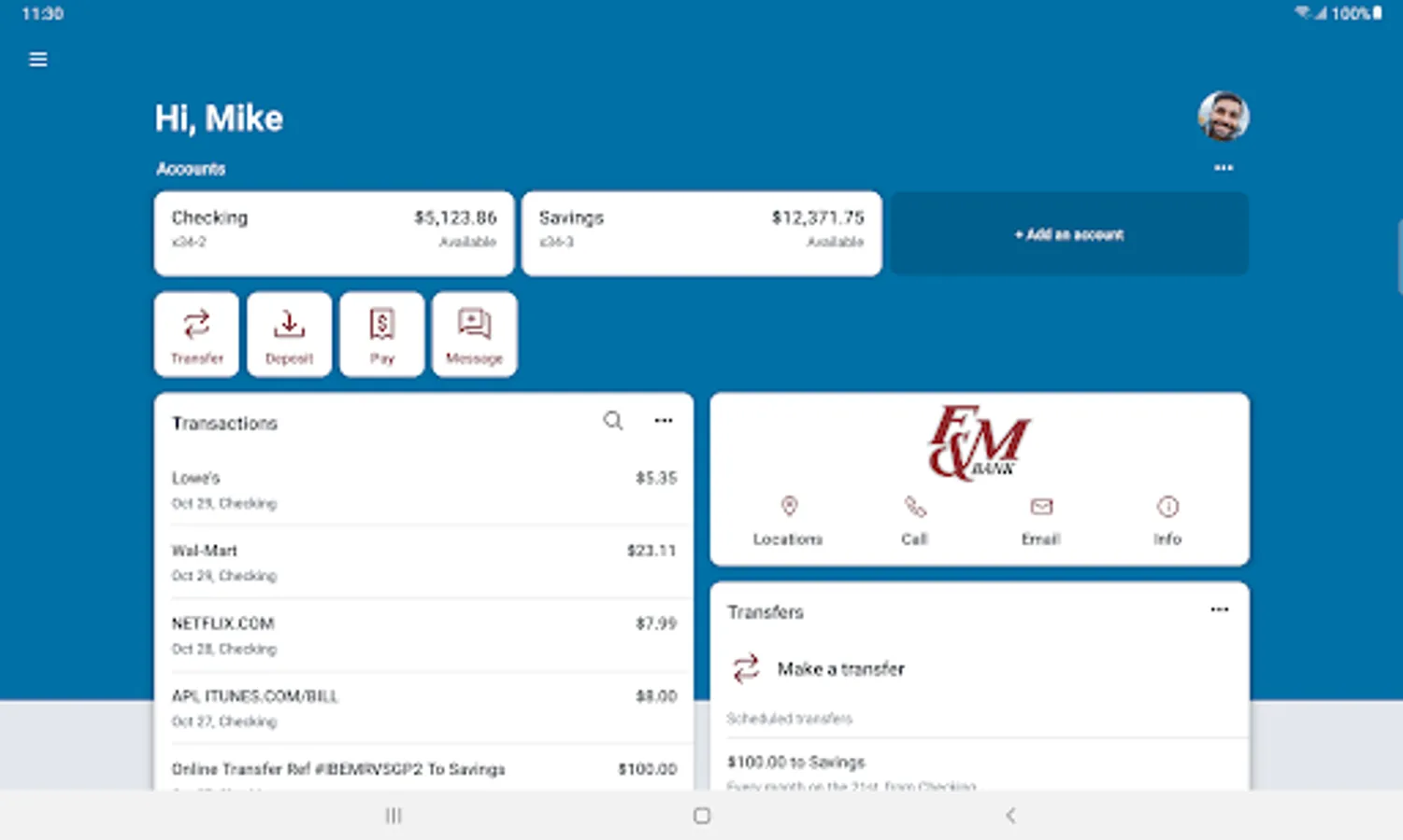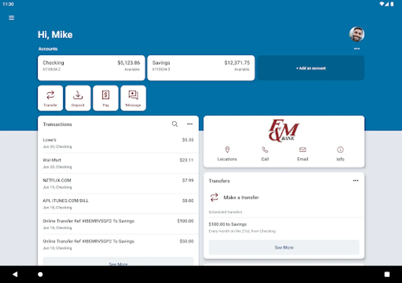 The F&M Bank app is the key to managing your money anytime, anywhere. It’s fast, secure and loaded with features that allow you to send and receive funds, as well as manage accounts.