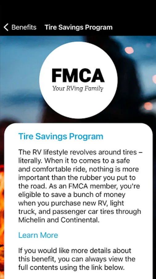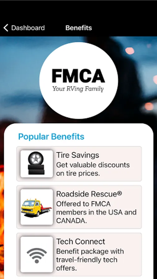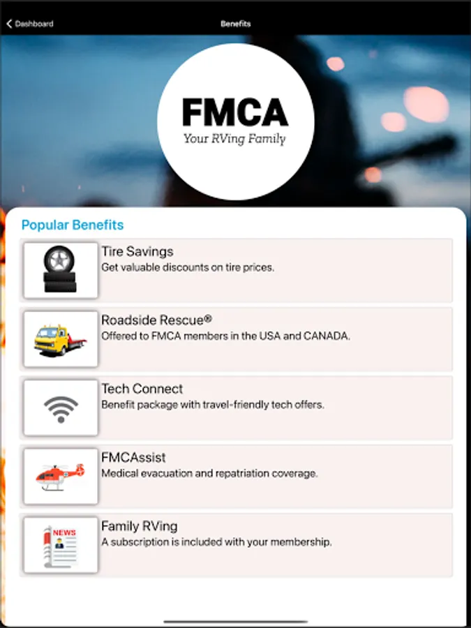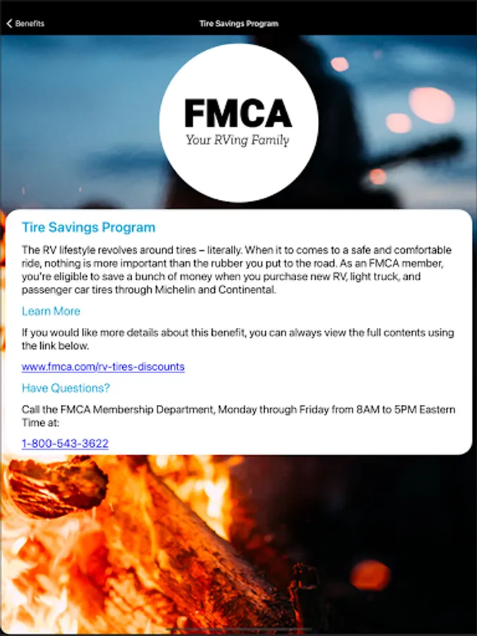 With a legacy of nearly 60 years and a passion for the outdoors, FMCA membership provides educational support, top quality services, benefits, and products, and a welcoming environment that contributes to making RVing easier for families. We know that RVers like to travel to all ends of the earth, and with the FMCA Mobile App, you’ll have all the important resources and contact information to ensure you can access and use your member benefits when you need them, no matter where you are or whether you have an internet connection.