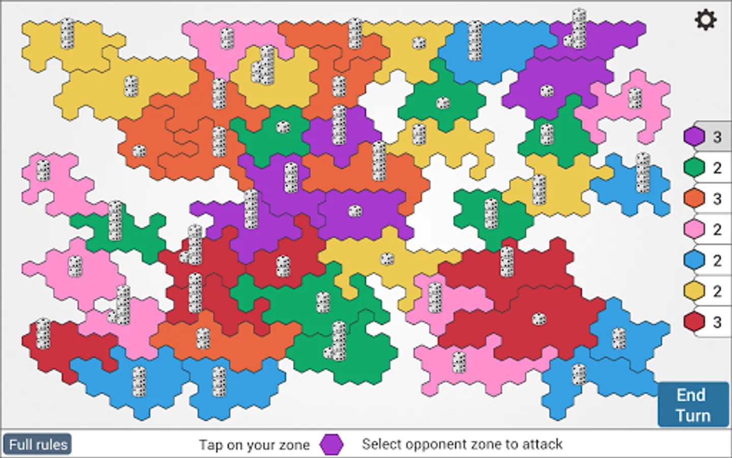 The purpose of the game is to control the entire map. To attack select your territory with at least 2 dices and then choose opponent territory bordered with selected. Who roll larger total number wins. Attacker must roll larger number than defender. You can attack multiple times per turn. At the end of the turn, the player receives a number of dices equal the largest connected territories he controls. Dices added randomly. Then turn goes to the next player.