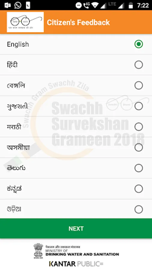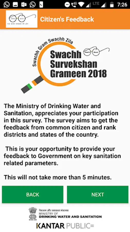 This is your opportunity to provide your feedback to Government on key sanitation related parameters. The Ministry of Drinking Water and Sanitation (MDWS) intends to undertake “Swachh Survekshan Grameen2018” to provide national ranking of all districts of India on the basis of sanitation (Swachhata) parameters. This ranking will be based on a comprehensive set of parameters including but not limited to the data from the citizen’s perception of Swachhata. This App aims to engage with citizens and solicit their feedback for improving the program. Data collected through this App will be kept confidential and stored in a secured server.