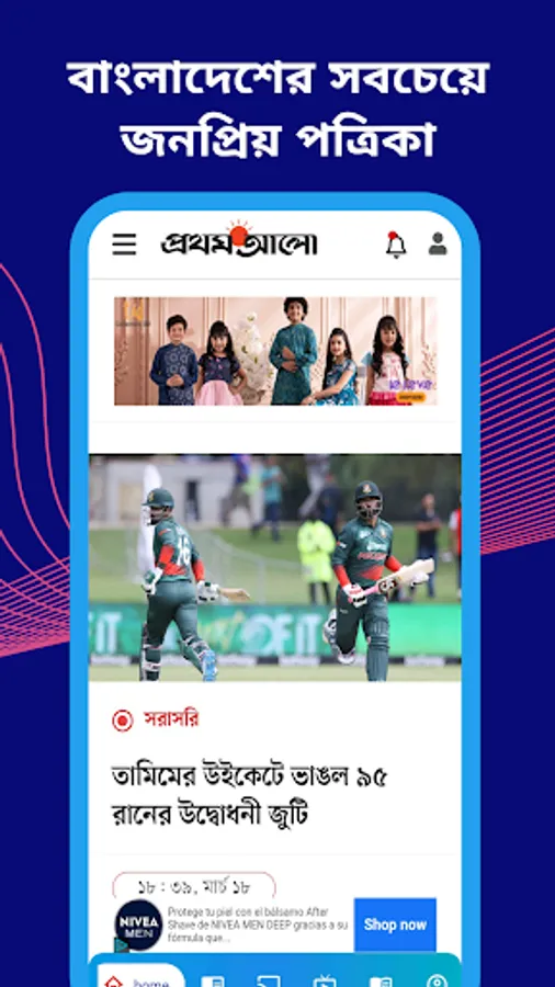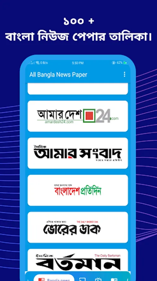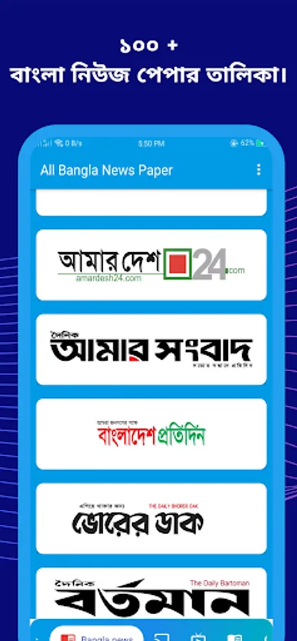 All Bangla News (Despite the growing popularity of Bangladeshi news websites, Bangla newspapers print versions are highly trusted. Following is a list of Bangla newspapers.), The Daily Naya Diganta is a Bengali daily newspaper published in Bangladesh, Bangladesh Pratidin (With a huge readership, Bangladesh Pratidin is counted among the leading newspapers in Bangladesh.) Prothom Alo (It is one of the highest circulated Bangladeshi newspapers.), Kaler Kantho (Another popular Bangla newspaper.), Jugantor (Daily Bangla newspaper providing quality news and information.) Ittefaq (Ittefaq is the oldest daily newspaper in Bangladesh.), Daily Samakal (Bangladeshi daily newspaper published in Dhaka.), Amader Shomoy (Broadsheet newspaper based in Bangla Motor, Dhaka.) Janakantha (Daily Bangla newspaper owned by Globe group.), Inqilab (Bangla daily broadsheet newspaper.) Bhorer Kagoj (Providing in-depth analysis on international news as well as local and regional perspectives.), Sangbad (One of the oldest newspapers in Bangladesh.), Jai Jai Din (Daily broadsheet, with latest news, headlines and analysis.), Sangram, Manobkantha (Daily newspaper based in Gulshan, Dhaka.) Alokito Bangladesh , Dinkal, Amar Sangbad, Ajkaler Khobor, Ajker Patrika, Protidiner Sangbad.