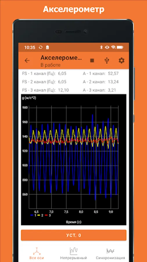 The graphic representation of the accelerometer signals, their amplitude and frequency characteristics is displayed in several modes: