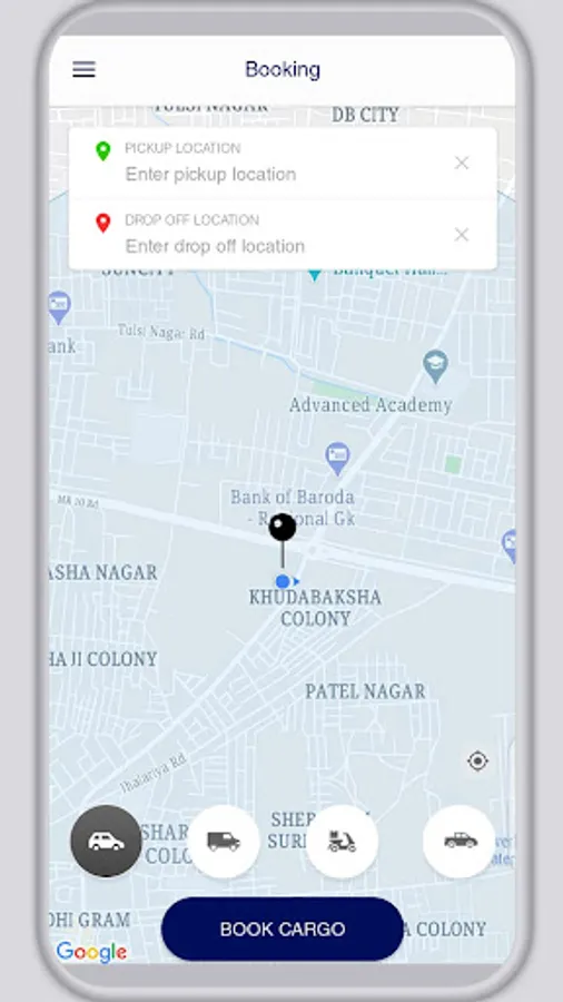 6. Book Cargo section – User can select the pickup address and Dropoff address along with different type of vehicles to select from