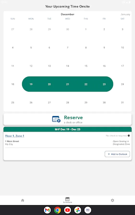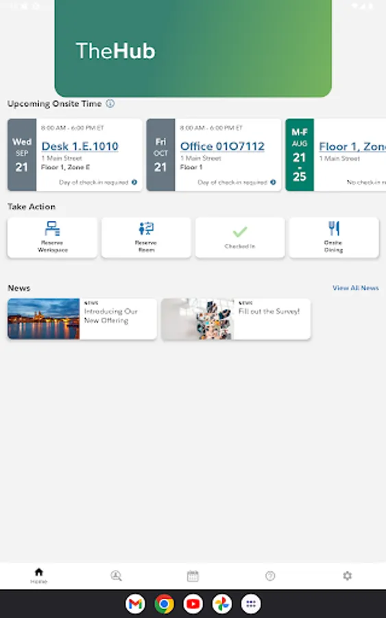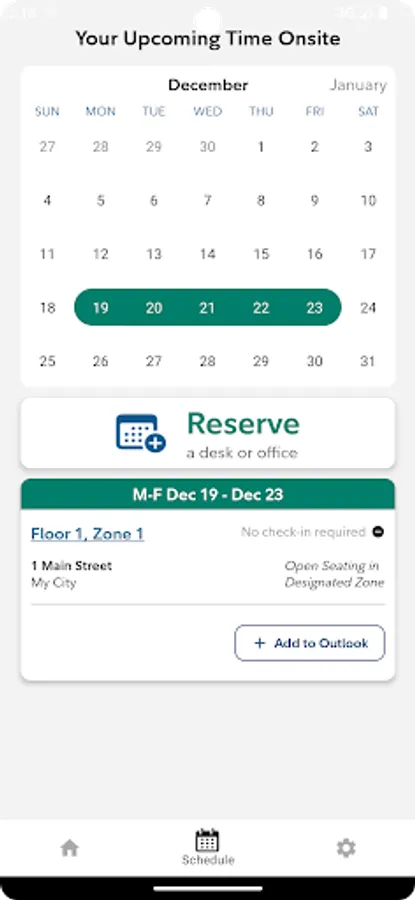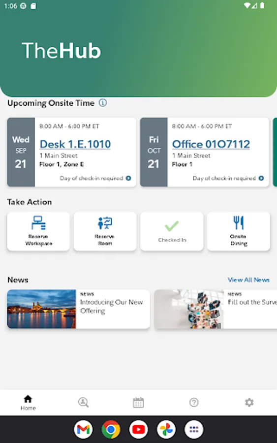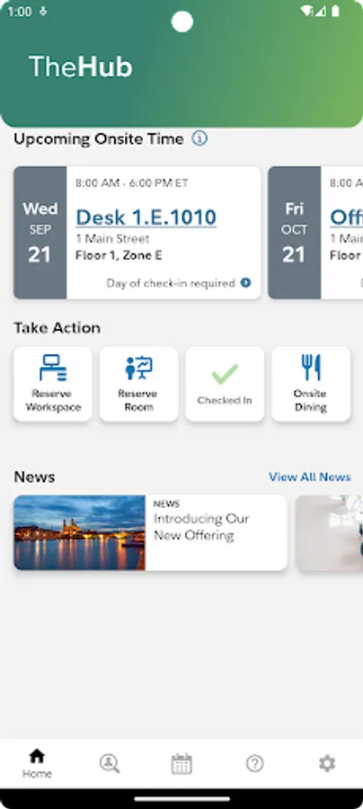 WorkHere integration allows for reserving and checking into desks.