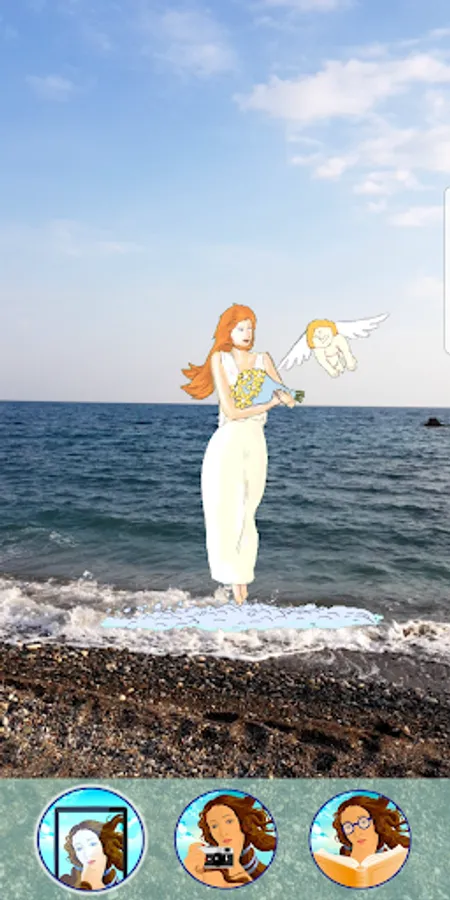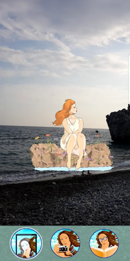 AR Mode: Use the camera of your device and by pointing it onto various points on the beach you can see the animated Aphrodite in front of you.