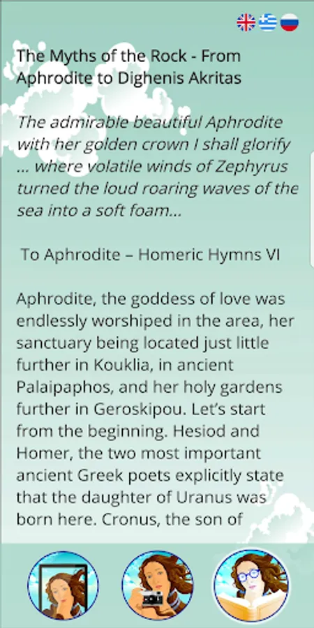Photo Mode: The app lets you move and scale the illustrated Aphrodite so as to photograph others or take a selfie with the goddess herself. You can easily share your photographs to your friends and family or your social media as a digital postcard from Pafos, Cyprus.