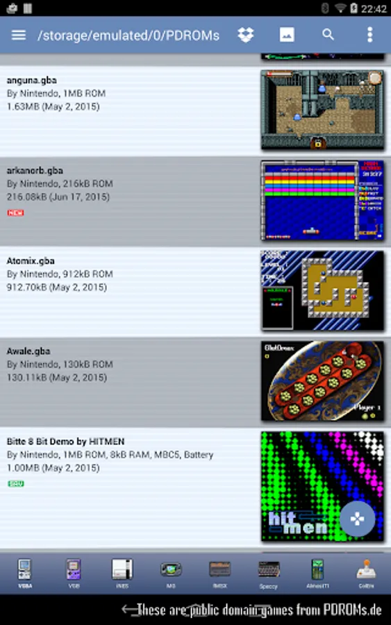 VGBAnext comes with a single public domain game. You can find more free public domain games at http://pdroms.de/. Please, do not run any software you do not own with VGBAnext.