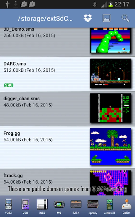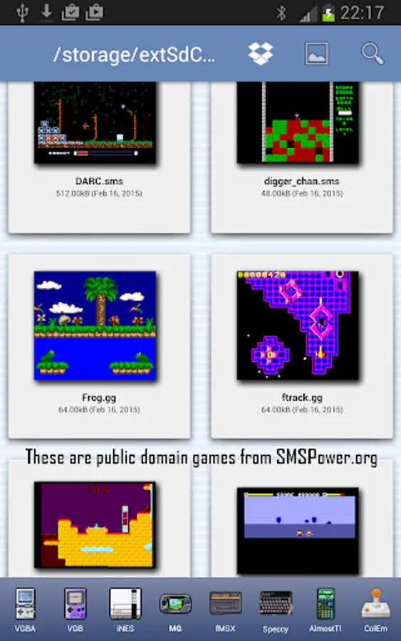 MasterGear package itself does not contain any games. You should place your own game files onto the SD card before running MasterGear.