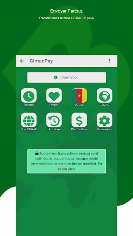 Transfer throughout the CEMAC zone. 6 countries, 53+ banks – 10+ microfinance – 10+ mobile operators, 33+ million wallets.