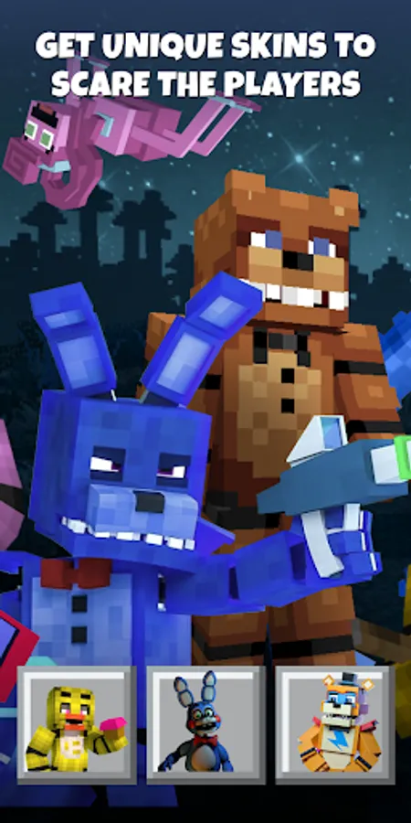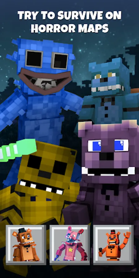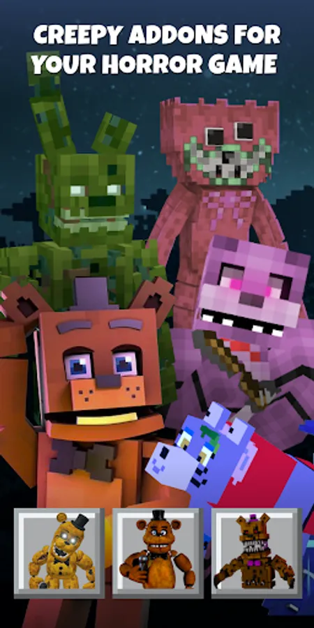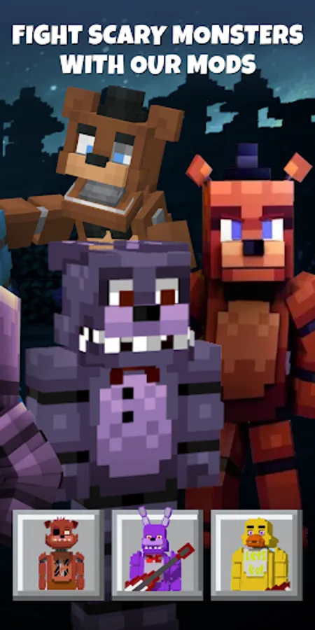 FNAF Mods for Minecraft is an application that contains your favorite in-game characters, their locations, and other add-ons from your favorite game. High-quality and smooth 3D graphics will allow you to immerse yourself in the horror and creepy atmosphere fully.