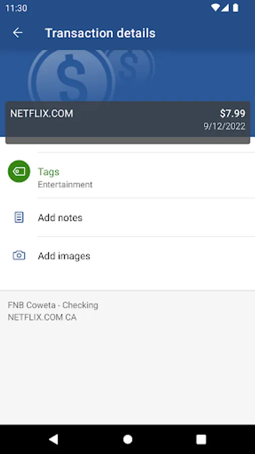 • Keep your transactions organized by allowing you to add tags, notes and photos of receipts and checks.