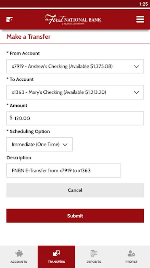 • Transfer funds between FNB Newtown accounts and other banks (3)