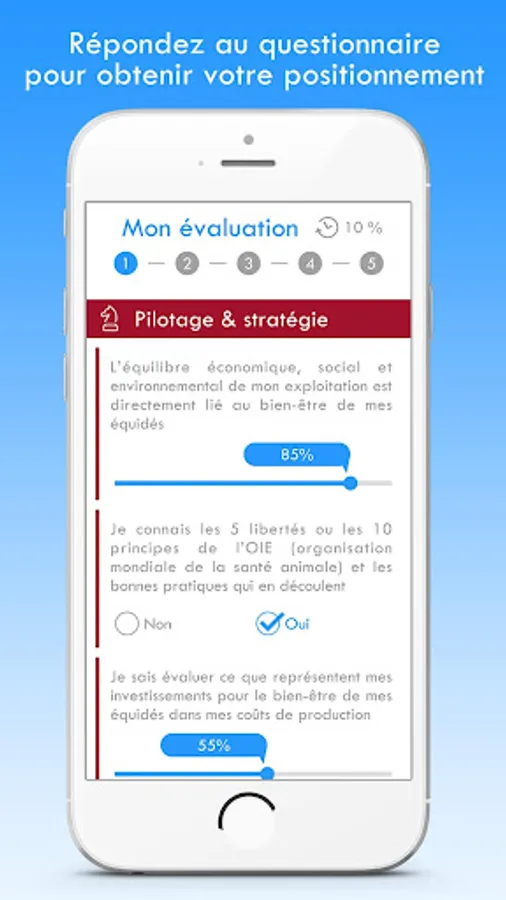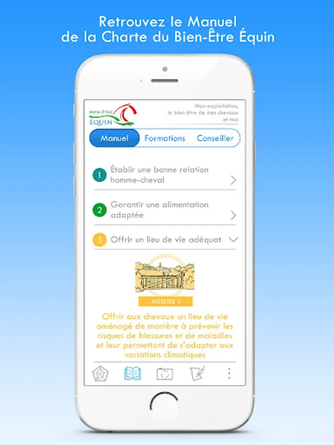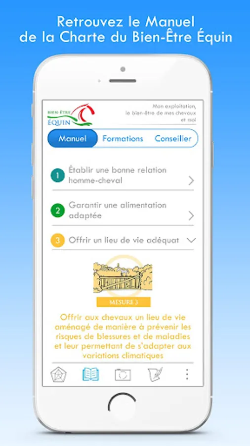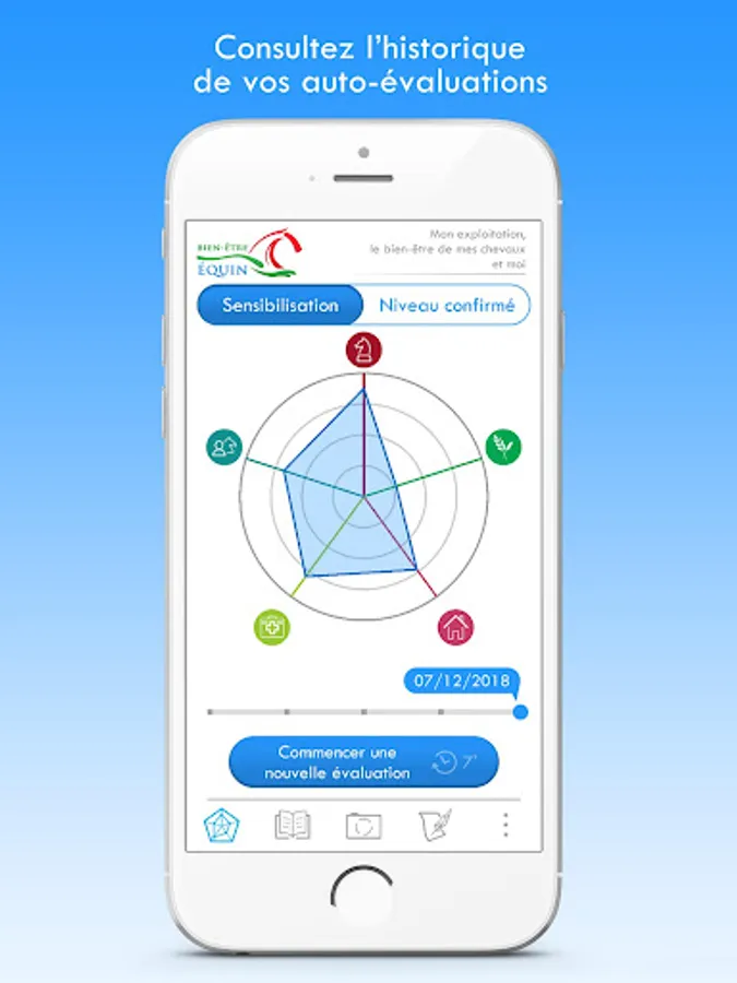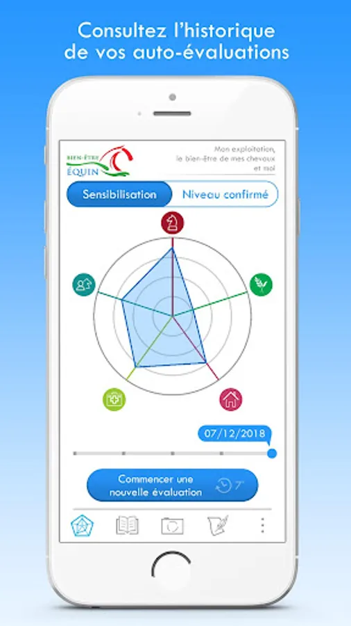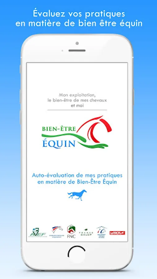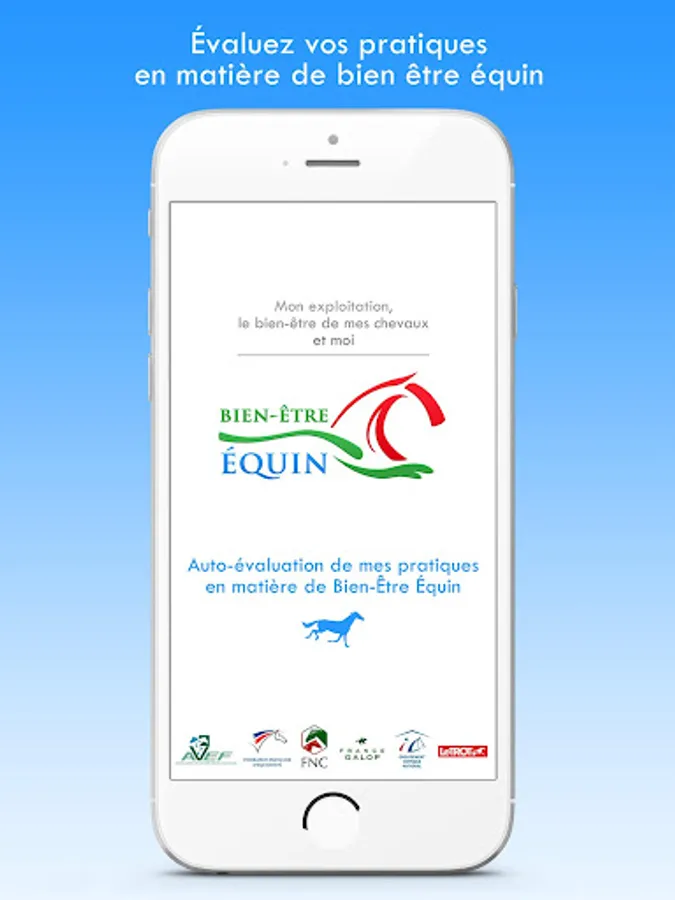 The purpose of this app is to help you assess your equine well-being practices quickly - and therefore incompletely. This is a first step in the process of progress put in place within the framework of the Charter for Equal Well-being, destined for the Horse sector.