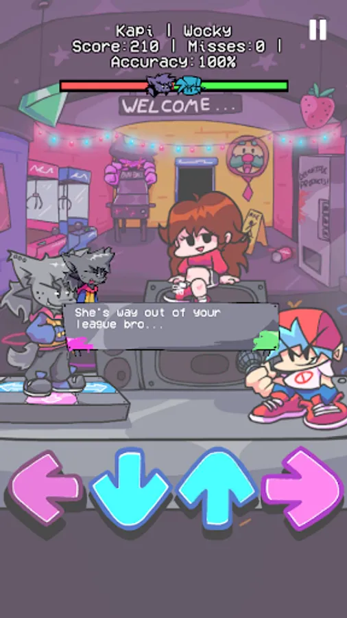 in fnf Music Battle: FNF Mod Kapi game, just tap the arrow when they perfectly match to get the highest score. Feel the fantastic funkin rhythm. Rock the beat. And, Try your best to beat Kapi as soon as possible to protect your Girlfriend.