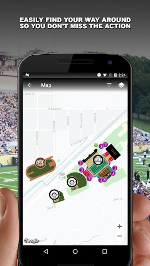 + INTERACTIVE STADIUM MAPS – Enhanced location-aware in-venue maps for fans, including amenities such as tailgating and parking, where available