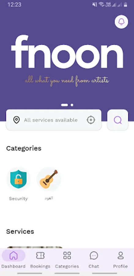 "تطبيق فنون يمكنك من حجز خدمات الفنانين ، الفن الموسيقي و الفن البصري و الفرق الفنية.