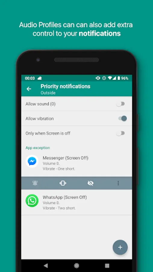 • Priority notifications for each profile: Control your apps notifications (ringtone, volume and vibration pattern). Also when the screen is off or on