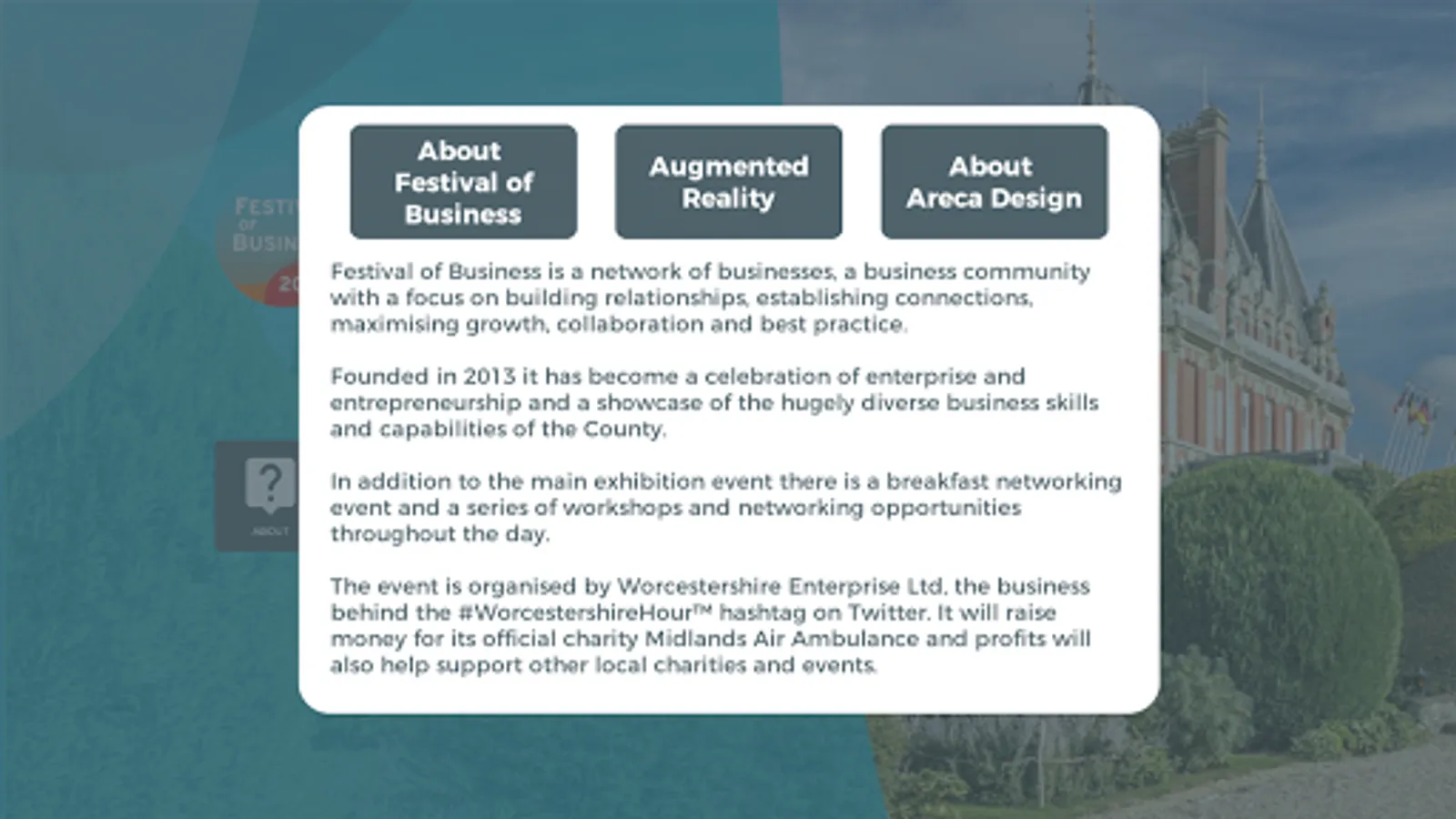 At the festival, visitors can experience the power of Augmented Reality (AR) by downloading this AR App. Once the AR app is open, the user can scan all of the business-stand logos and take part in an interactive quiz (found on just 10 secret logos)