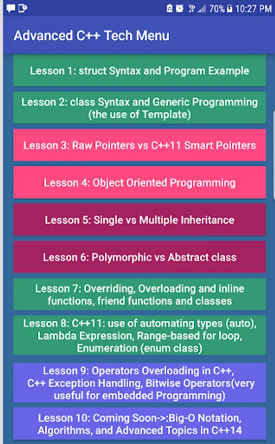 Advanced C++ Tech is based on Object Oriented Programming in C++ and up-to-date topics of many features from C++11. Advanced C++ Tech will help C++ developers understanding the key concepts of object oriented programming in C++. Users will also learn C++11 features such as the use of Lambda Expressions, Smart-Pointers, Range-based for loop, map container, and the use of enum class. Advanced C++ Tech will prepare its users with cutting-edge programming skills in C++ and key C++ job interviews questions.