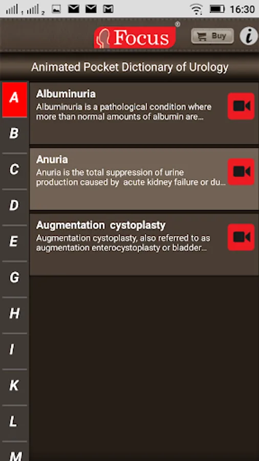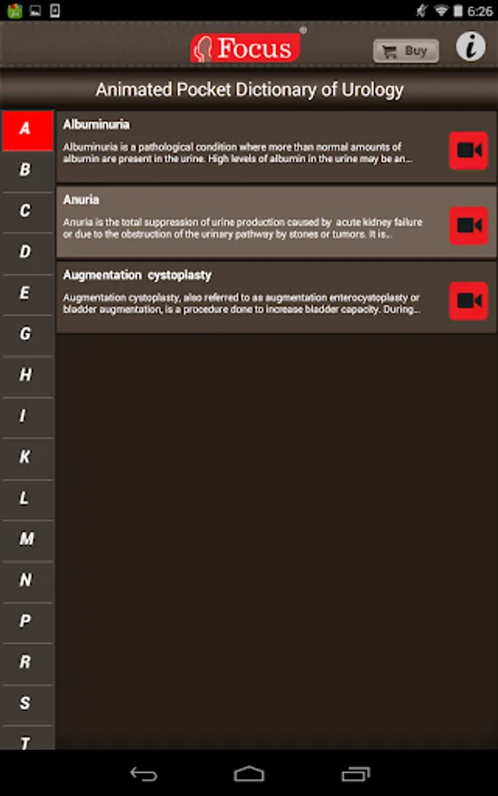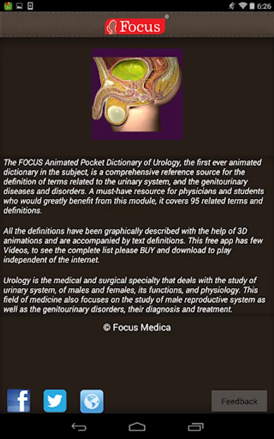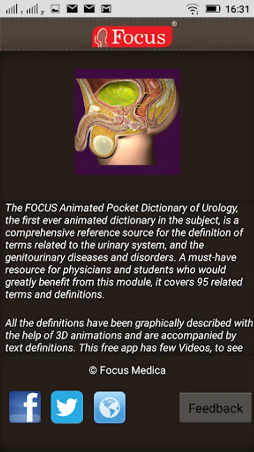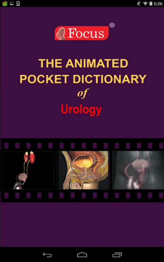 The FOCUS Animated Pocket Dictionary of Urology, the first ever animated dictionary in the subject, is a comprehensive reference source for the definition of terms related to the urinary system, and the genitourinary diseases and disorders. A must-have resource for physicians and students who would greatly benefit from this module, it covers 95 related terms and definitions.