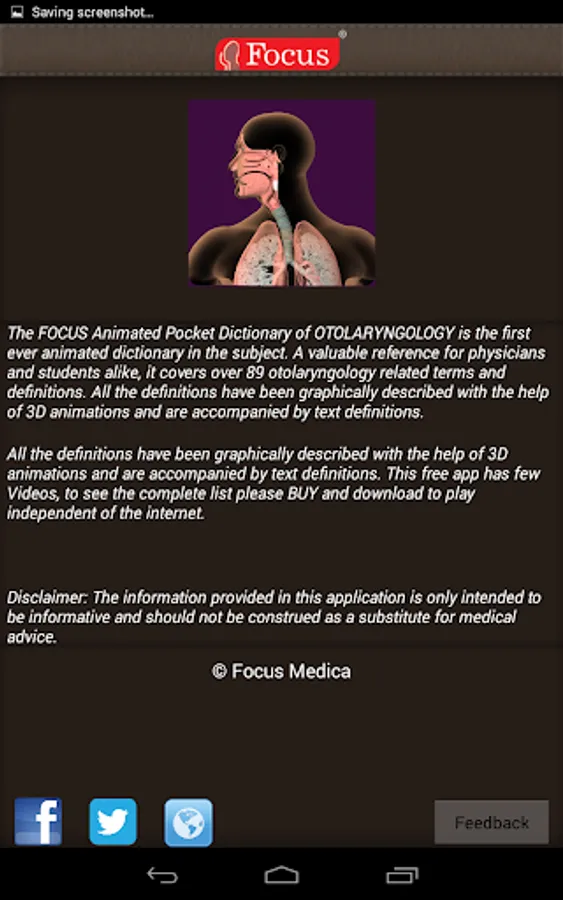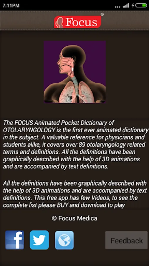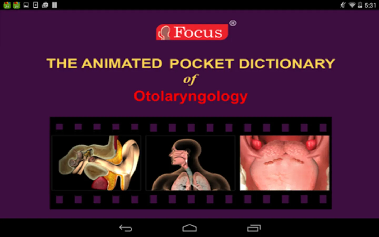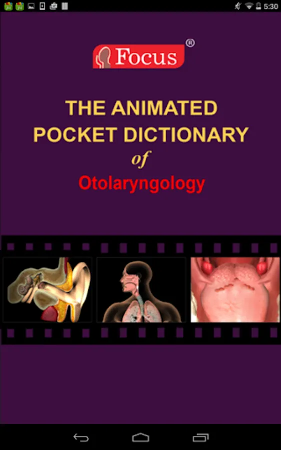 The FOCUS Animated Pocket Dictionary of OTOLARYNGOLOGY is the first ever animated dictionary in the subject. A valuable reference for physicians and students alike, it covers over 85 otolaryngology related terms and definitions. All the definitions have been graphically described with the help of 3D animations and are accompanied by text definitions.