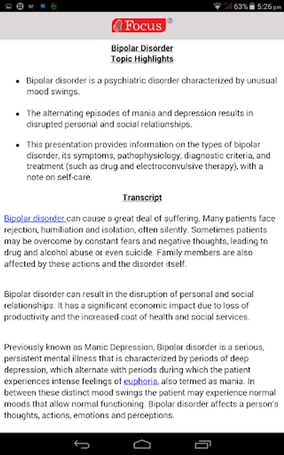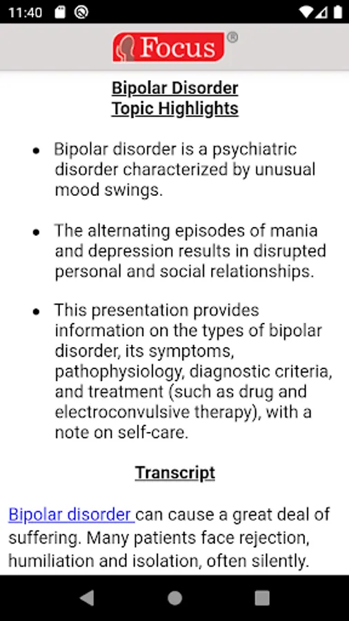 This presentation provides basic education about the nature of the disorder and helps in understanding the need to take medication over many years.
