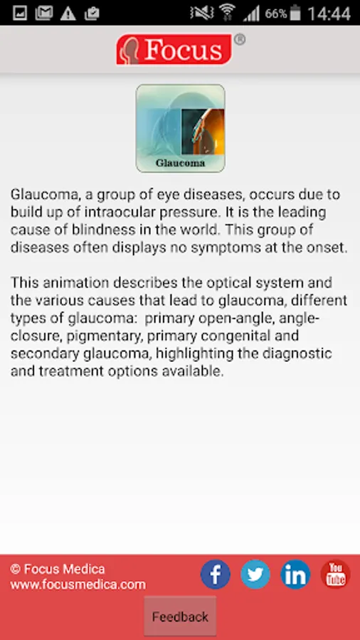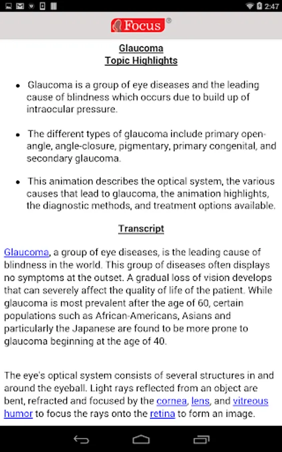 This animation describes the optical system and the various causes that lead to glaucoma, different types of glaucoma: primary open-angle, angle-closure, pigmentary, primary congenital and secondary glaucoma, highlighting the diagnostic and treatment options available.
