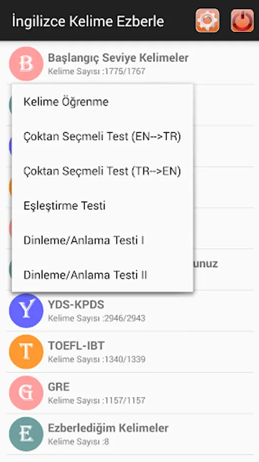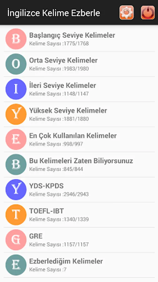 "Beginner Words," "Intermediate Words", "Advanced Words," "High Level Words", "The Most Used Words", "KPDS, YDS (Foreign Language Examination)", "TOEFL IBT", "GRE" and "You already know the words" located in 9 different categories, including words.