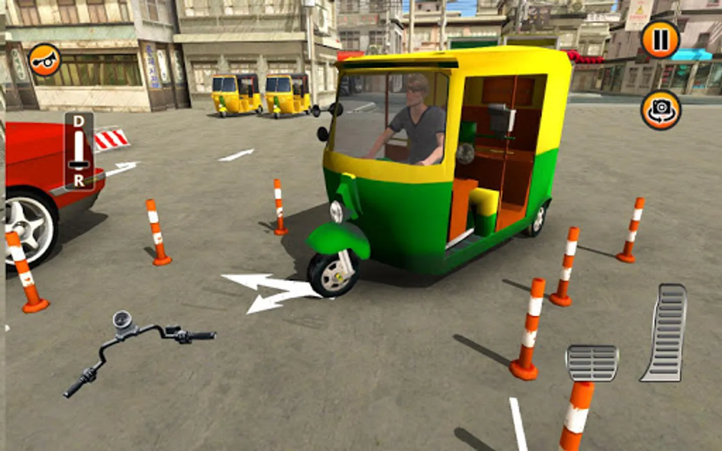 Features in the 3d auto rickshaw parking: tuk-tuk driver game are: