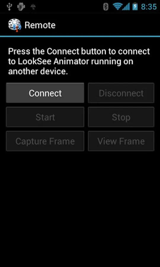 LookSee Remote lets you connect your phone to an instance of LookSee Animator running on another device, and control it remotely. This is handy if, for example, you want to capture a time-lapse video from your tablet sitting on a stand in the corner of a room at a party or something, and monitor it from your phone. You can start and stop captures from the remote, trigger frame captures manually, view the current frame, and monitor capture progress.
