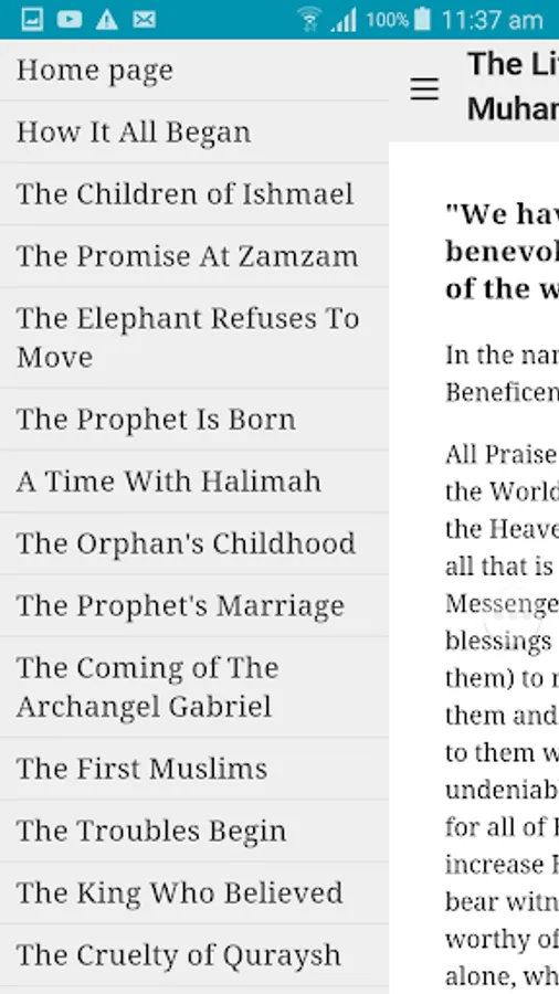 In this app, you can learn the life story of Prophet Muhammad peace be upon him in English. The app is devided into parts following a chronological order from his birth to his death, and each part is devided into sections in the form of small paragraphs to facilitate reading.