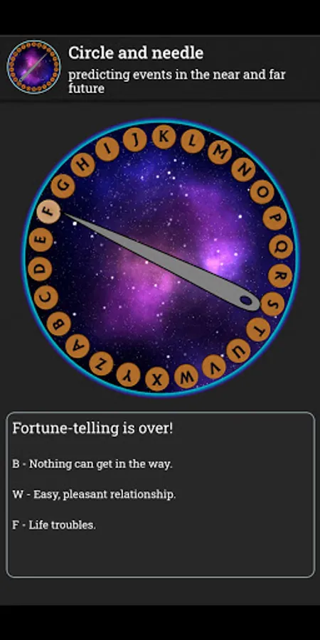 Fortune telling on a circle and a needle - short predictions for the events of the near and distant future. To start fortune telling, you need to rotate the needle inside the circle with letters. The result will depend on the letter on which the needle stops rotating. Each letter has its own little prediction.